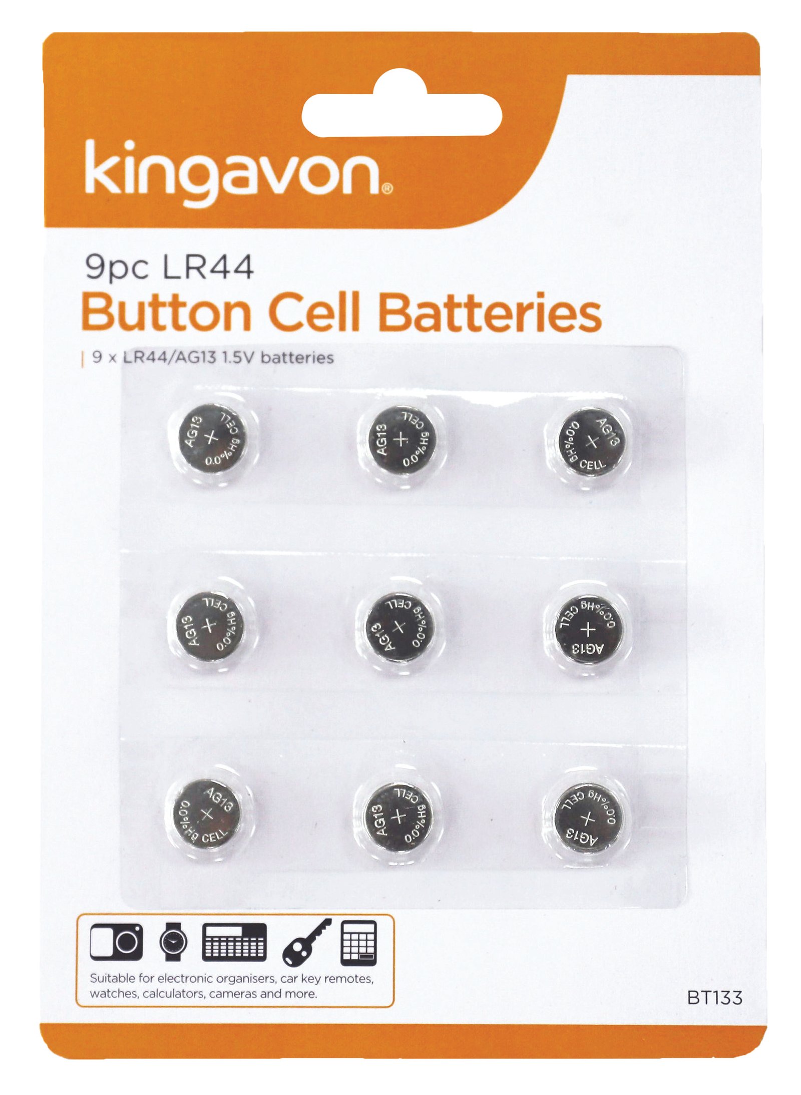 Set of 9 LR44 button cell batteries for watches, calculators, toys, and small electronics. Reliable, long-lasting power for everyday devices.