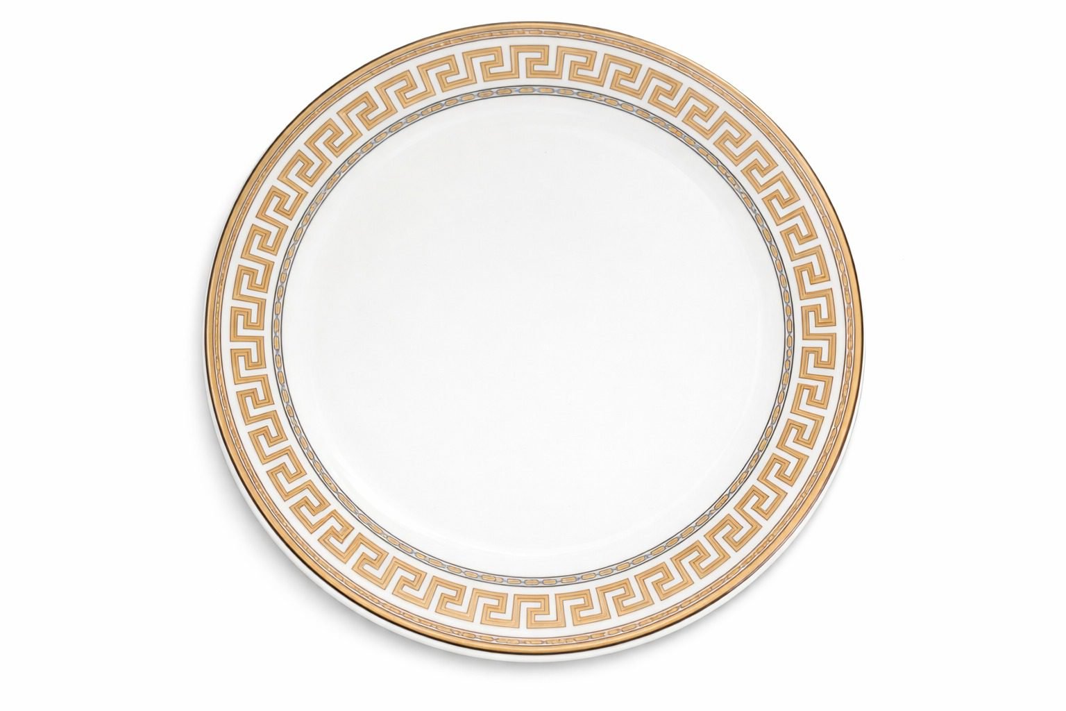Add a touch of elegance to your table with this white dinner plate featuring a classic gold Greek key border. Perfect for everyday dining or special occasions, it complements both modern and traditional table settings. Durable, stylish, and easy to pair with existing dinnerware.